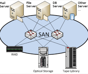 A storage area network (SAN) or storage network is a computer network which provides access to consolidated, block-level data storage. SANs are primarily used to access data storage devices, such as disk arrays and tape libraries from servers so that the devices appear to the operating system as direct-attached storage. A SAN typically is a dedicated network of storage devices not accessible through the local area network (LAN).