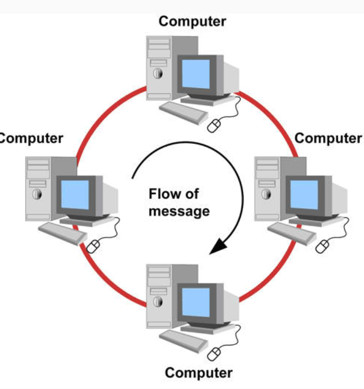 Ring network: each node is connected to its left and right neighbour node, such that all nodes are connected and that each node can reach each other node by traversing nodes left- or rightwards. Token ring networks, and the Fiber Distributed Data Interface (FDDI), made use of such a topology